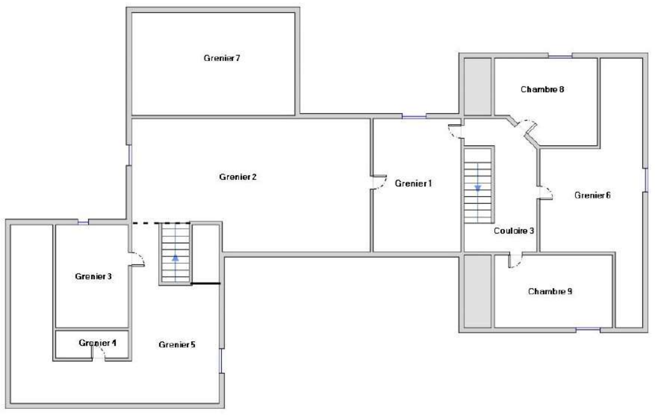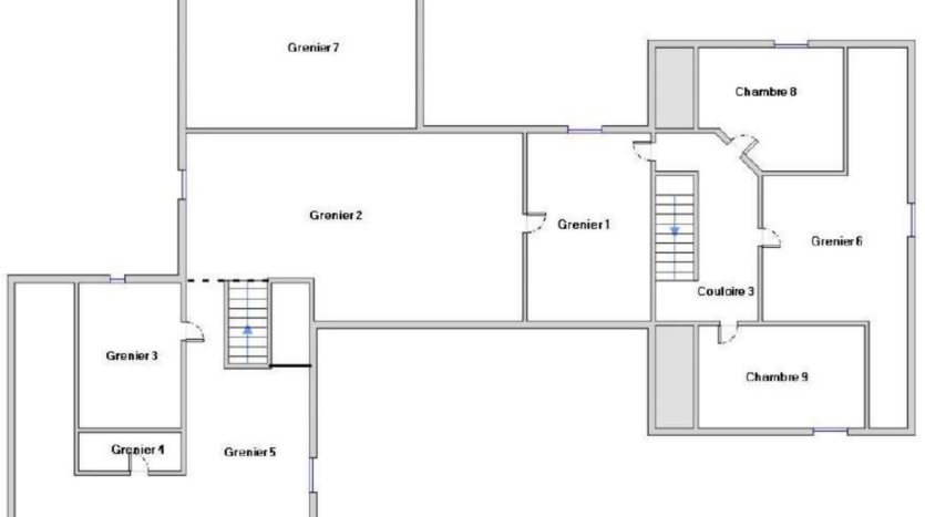 L’aile droite accueille au rez-de-chaussé une entrée desservant une grande pièce principale de 45m2, suivi d’une douche et d’un WC. Au premier étage, trois chambres supplémentaires sont présentes, ainsi qu’une salle d’eau et un WC. Au second étage, deux chambres ainsi que l’accès aux greniers.