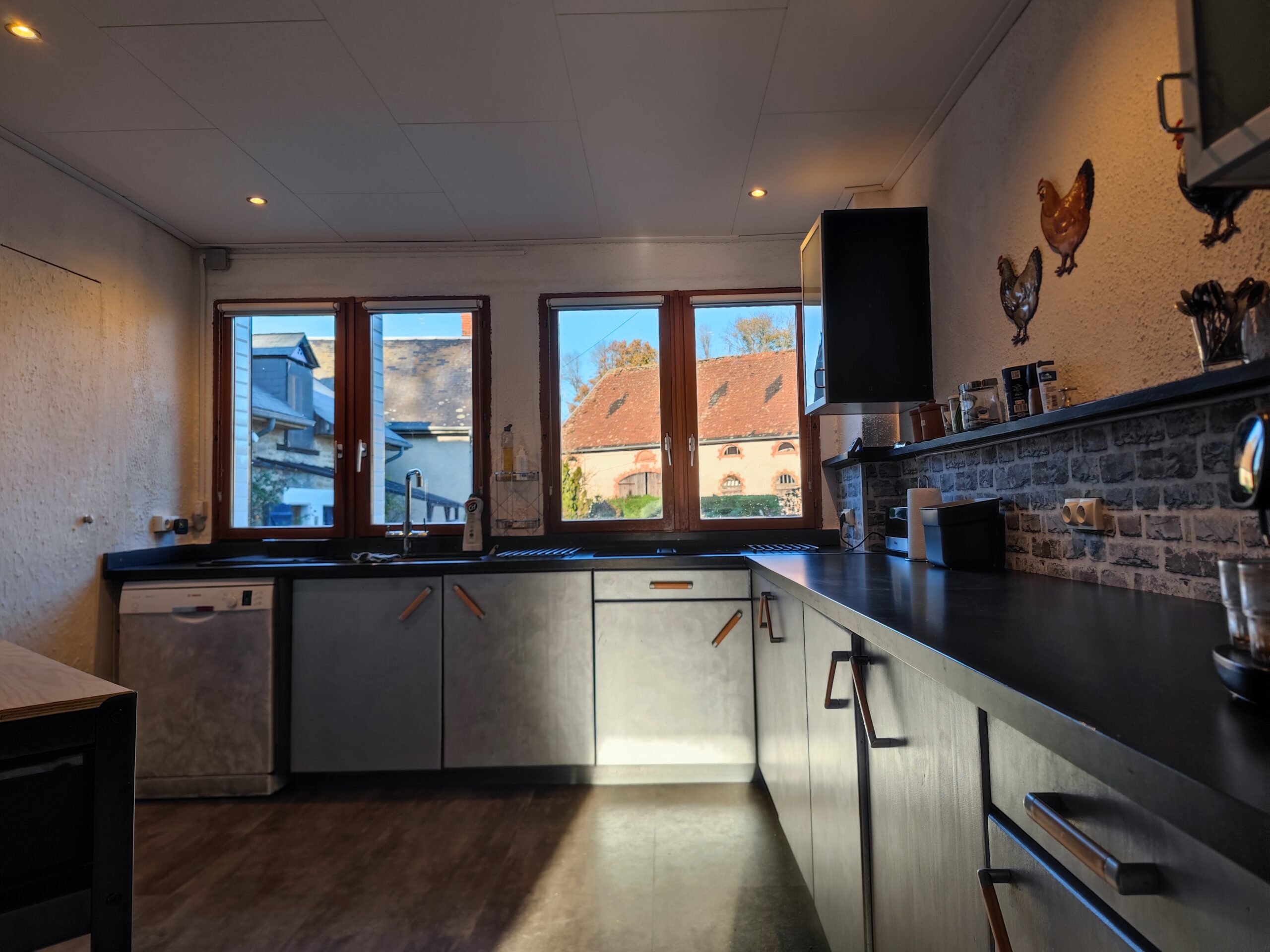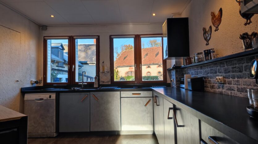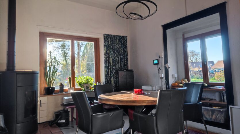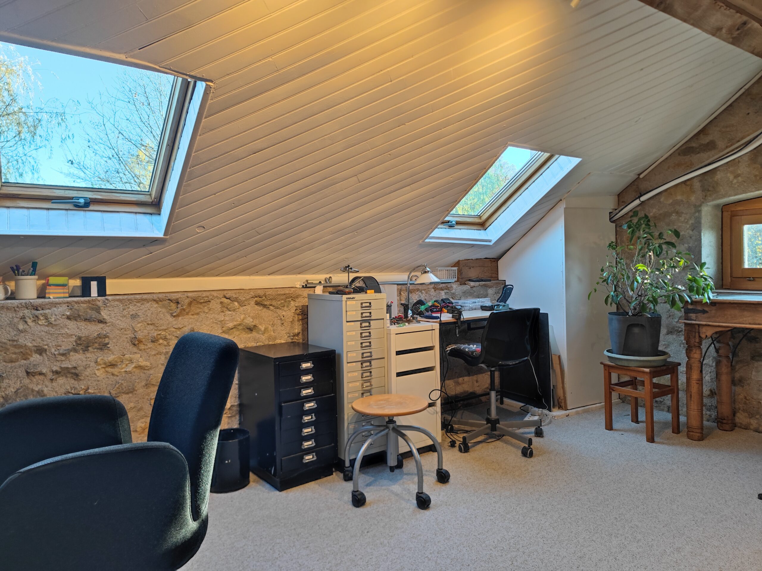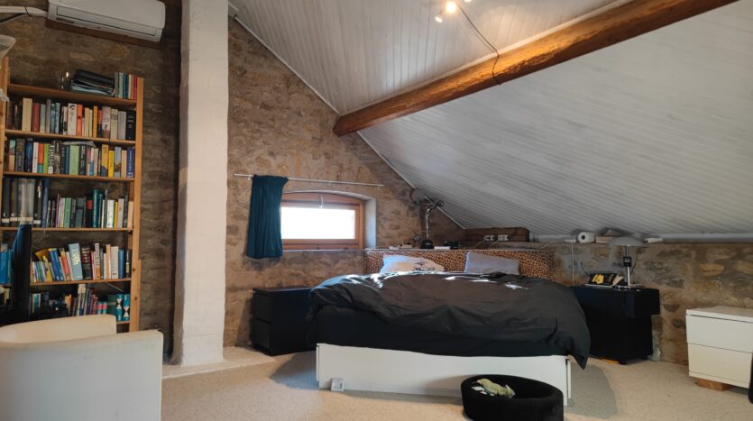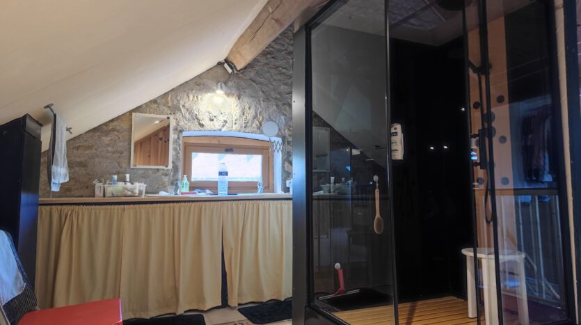 L’habitation principale d’une superficie de 115m2, se compose au RDC d’une cuisine semi-ouverte sur salle à manger, suivie d’un salon et d’un bureau. A l’étage, vous trouverez un vaste espace ouvert de 55m2 accueillant une chambre, une salle d’eau avec WC et un dressing. La maison est chauffée avec un poêle à granulés et un poêle à bois pour le RDC et une clim réversible pour l’étage. Double vitrage présent.