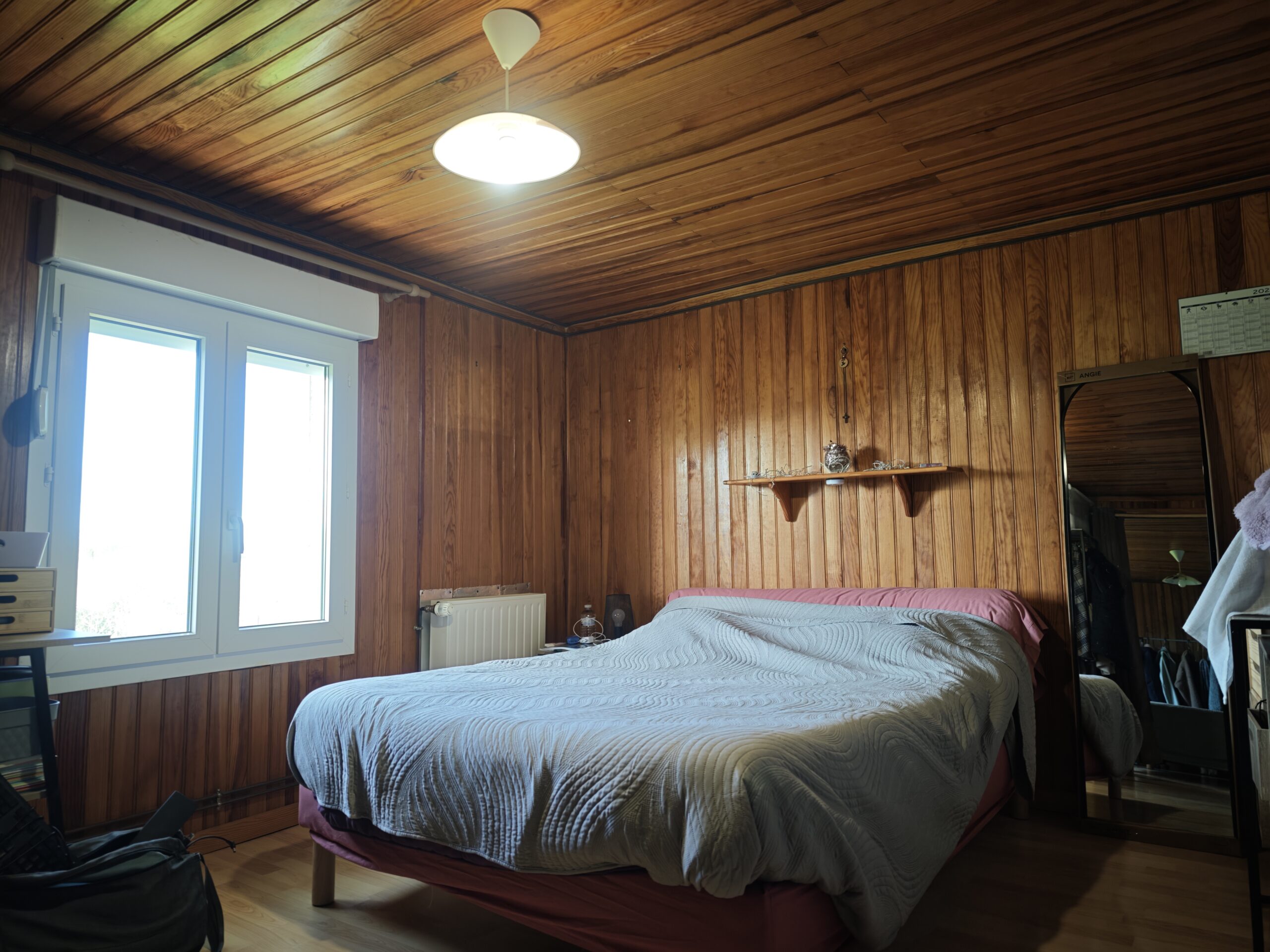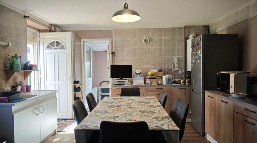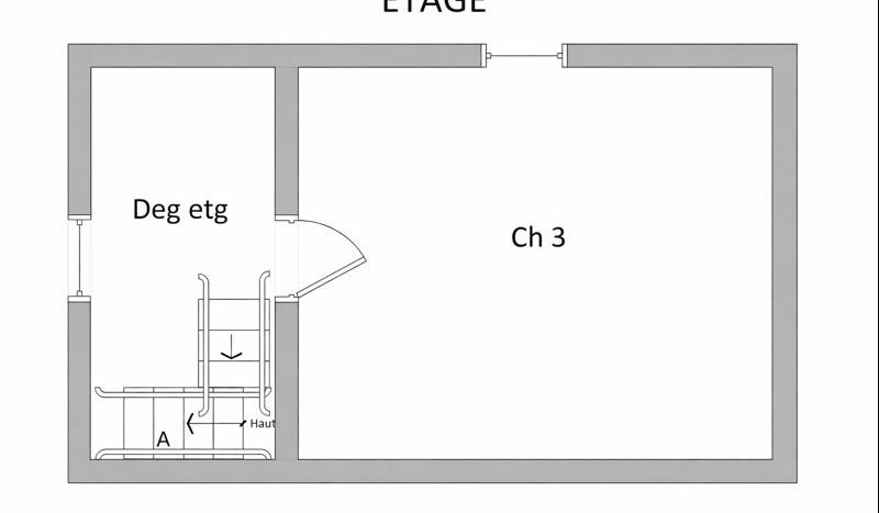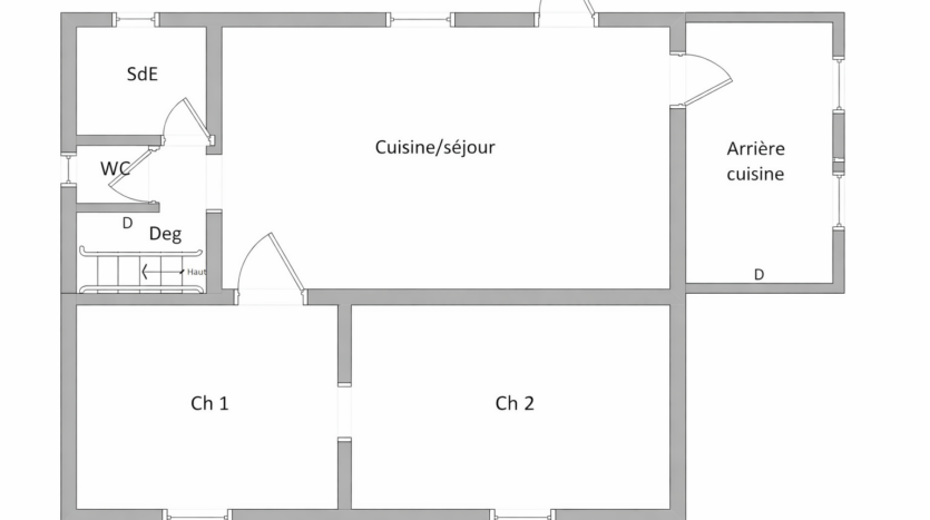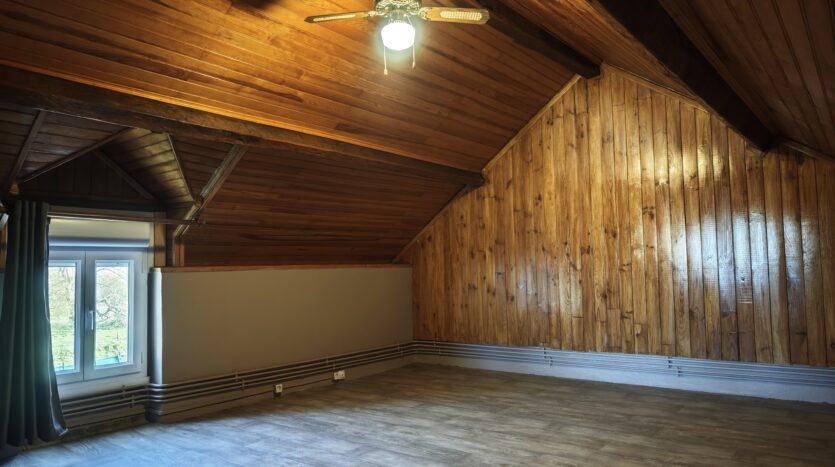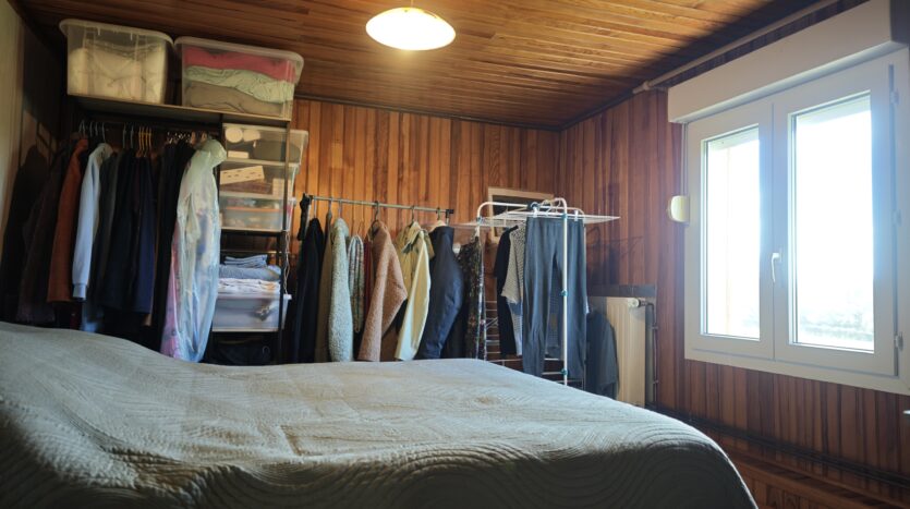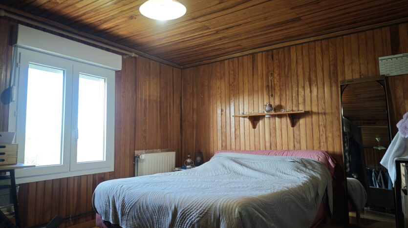 La maison est composée au rez-de-chaussée d’une pièce de vie avec coin cuisine, buanderie, suivi par deux chambres en enfilades, une petite salle d’eau et un WC. A l’étage, un palier dessert une grande chambre supplémentaire. Une cave ainsi qu’un double garage sont également présents.