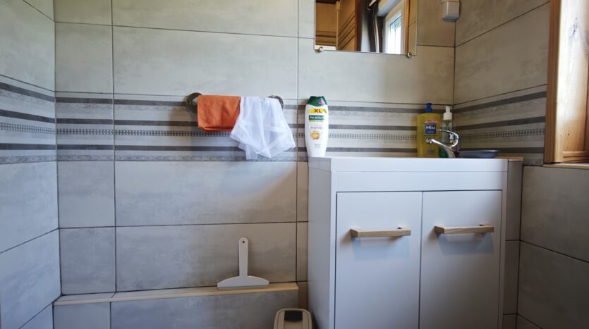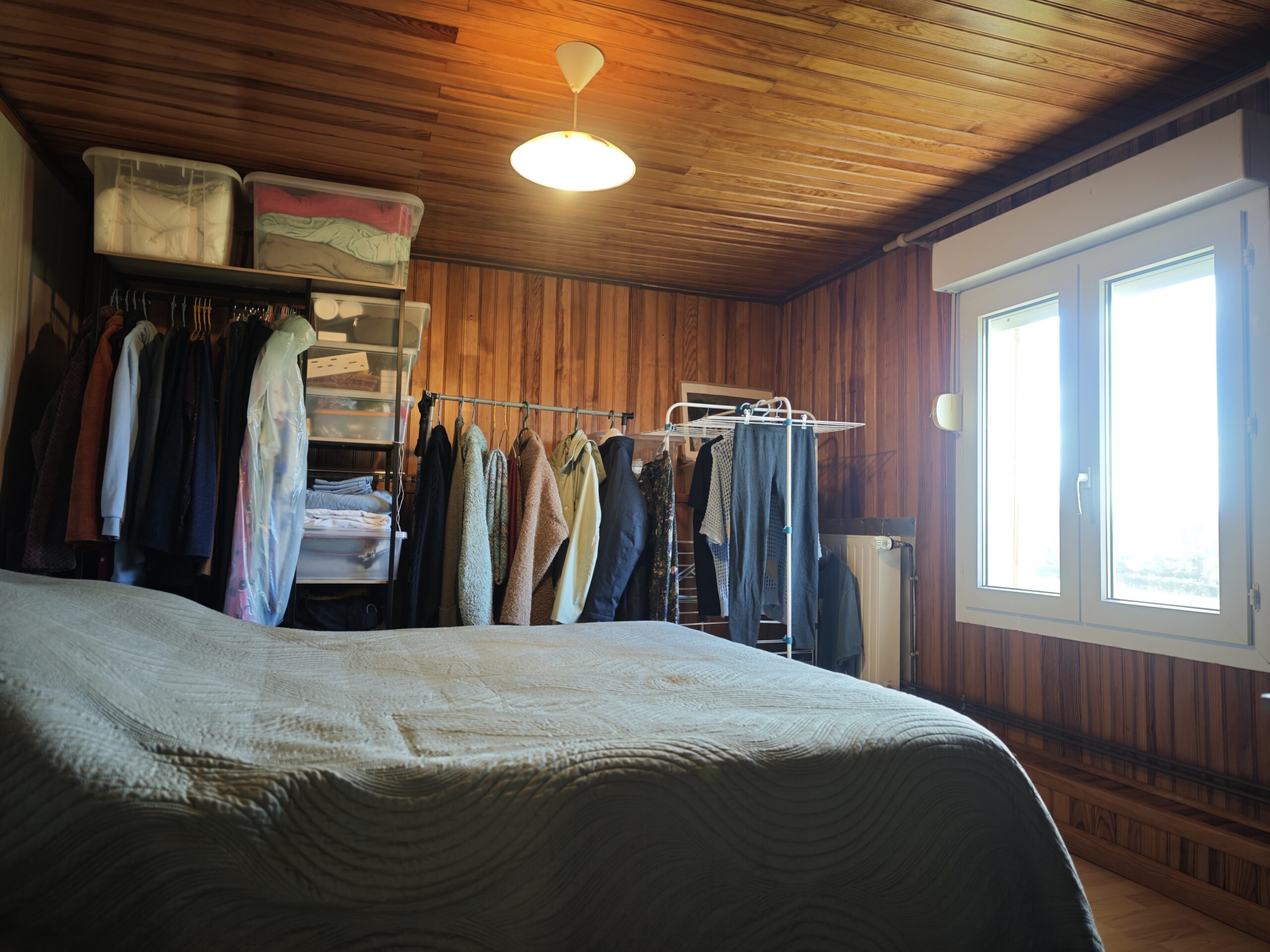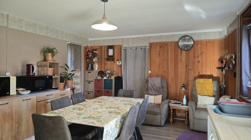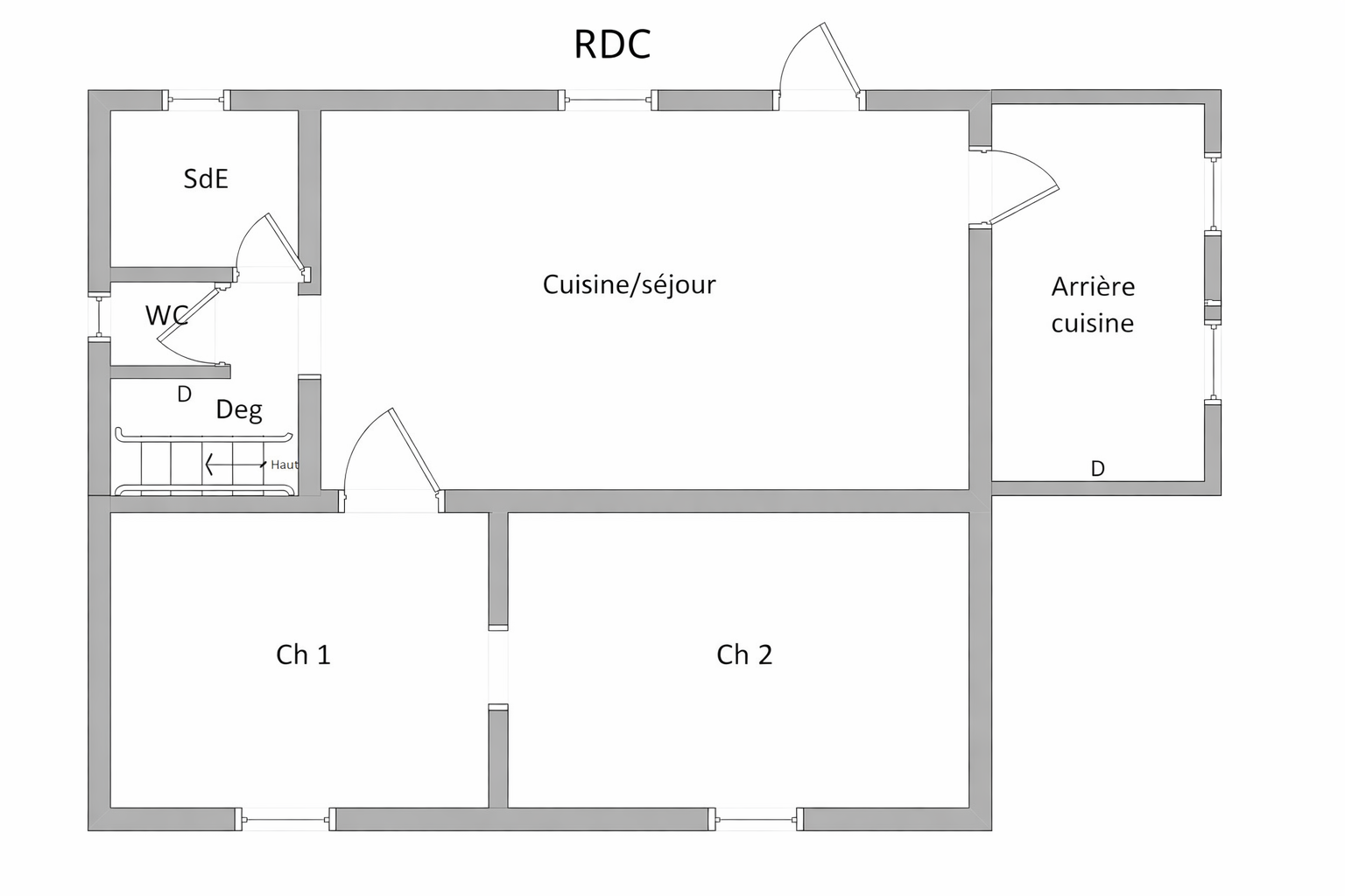 La maison est composée au rez-de-chaussée d’une pièce de vie avec coin cuisine, buanderie, suivi par deux chambres en enfilades, une petite salle d’eau et un WC. A l’étage, un palier dessert une grande chambre supplémentaire. Une cave ainsi qu’un double garage sont également présents.
