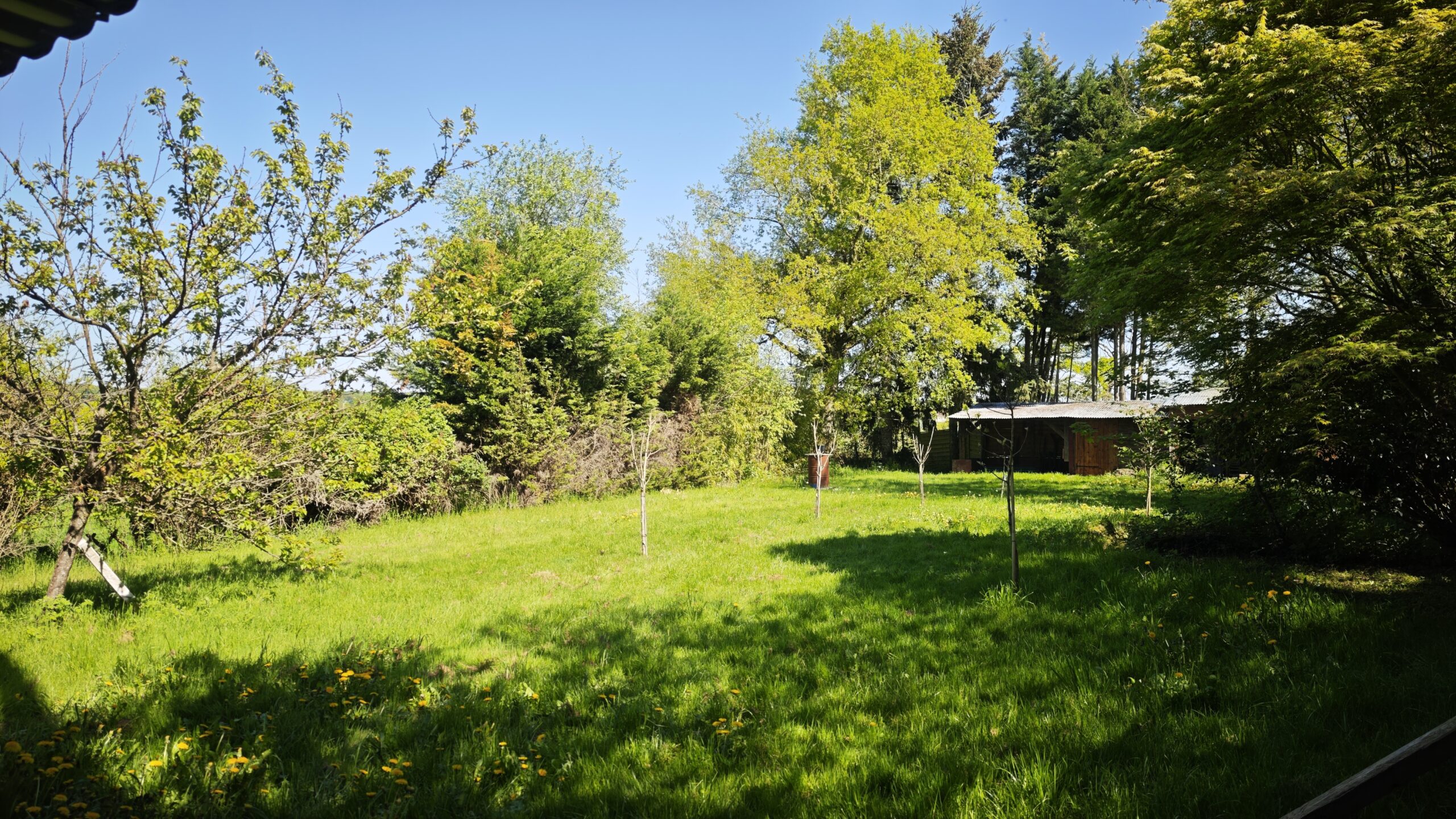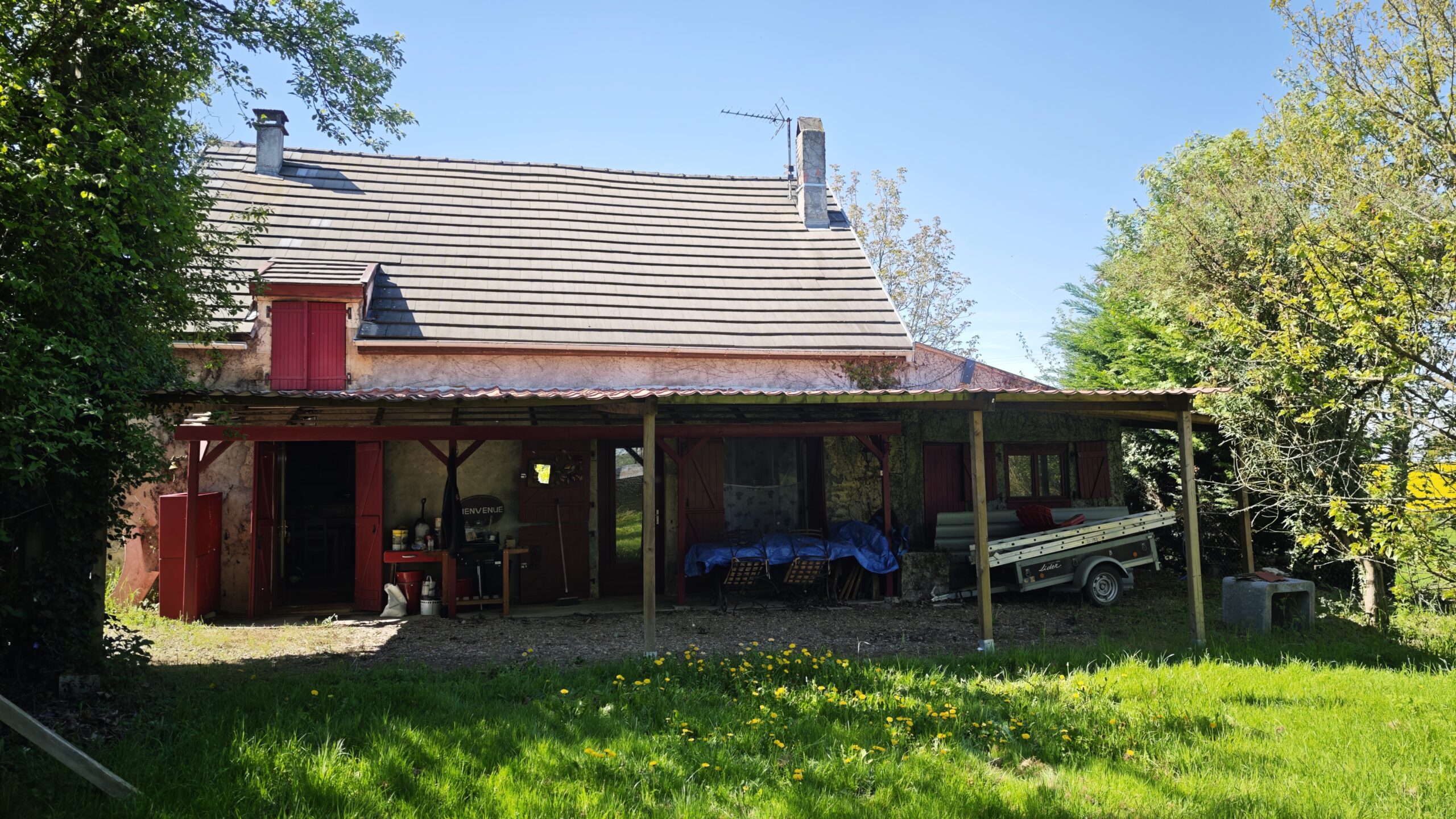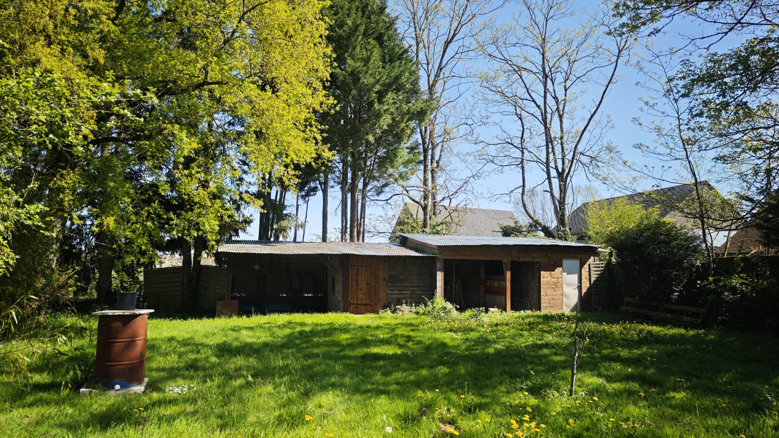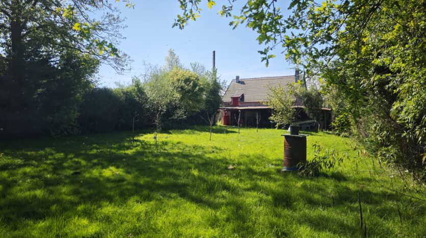 Une grande terrasse couverte donne sur un jardin arboré de 1000m2 dôté d’une dépendance.