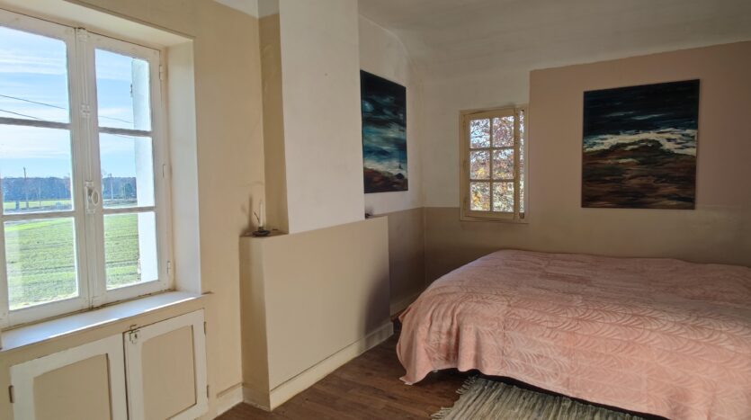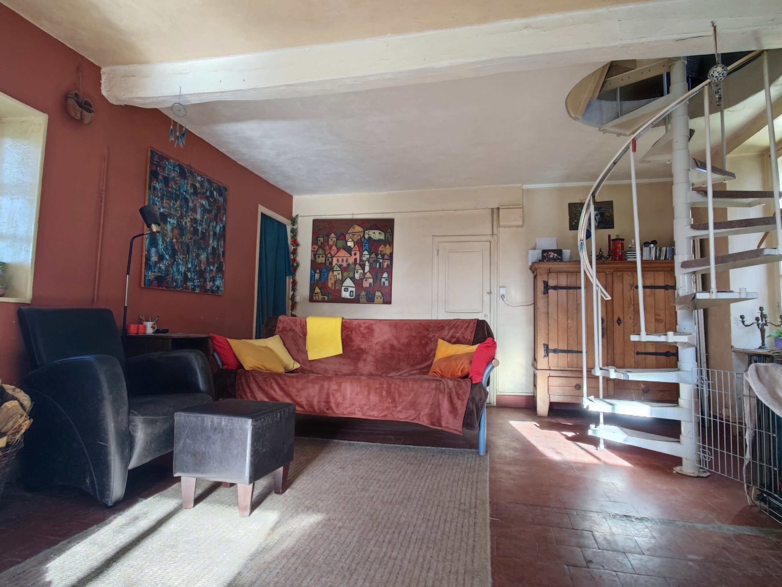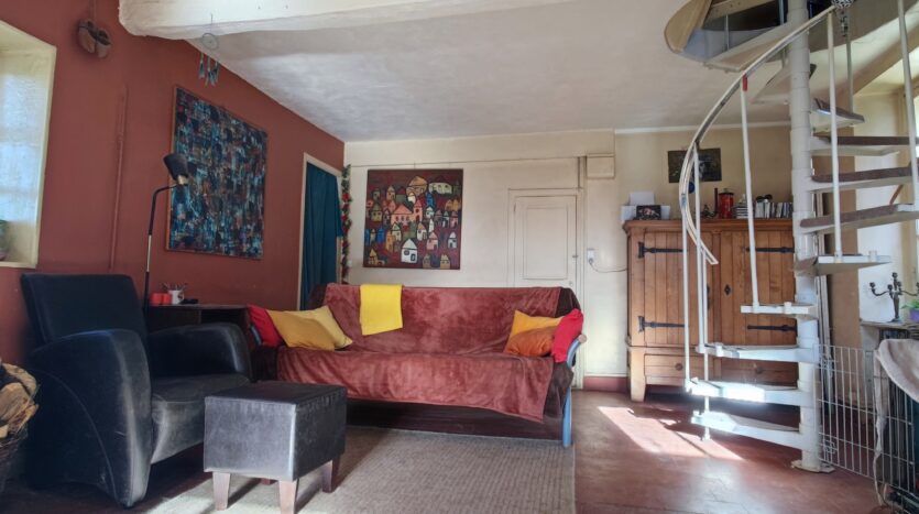 La maison se compose au rez-de-chaussée d’une entrée desservant une pièce de vie, une cuisine suivie d’un WC, d’un espace buanderie et de petites dépendances accessibles depuis l’habitation. A l’étage, un palier dessert un grand espace de 30m2 faisant office de salon, suivi d’une chambre, d’une salle d’eau avec WC et d’un grenier aménageable. L’étage possède également un accès indépendant donnant sur le salon ce qui en fait un espace idéal pour recevoir. Une chambre supplémentaire peut y être créée facilement.